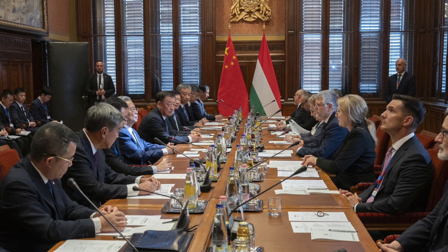 Budapest, 2025. július 25. Kövér László, az Országgyűlés elnöke (j4) plenáris megbeszélést folytat Zhao Lejivel, a Kínai Népköztárság Országos Népi Gyűlése Állandó Bizottságának elnökével (b4) az Országház Munkácsy-termében 2025. július 25-én. Jobbról Mátrai Márta, az Országgyűlés háznagya (j5). MTI/Szigetváry Zsolt