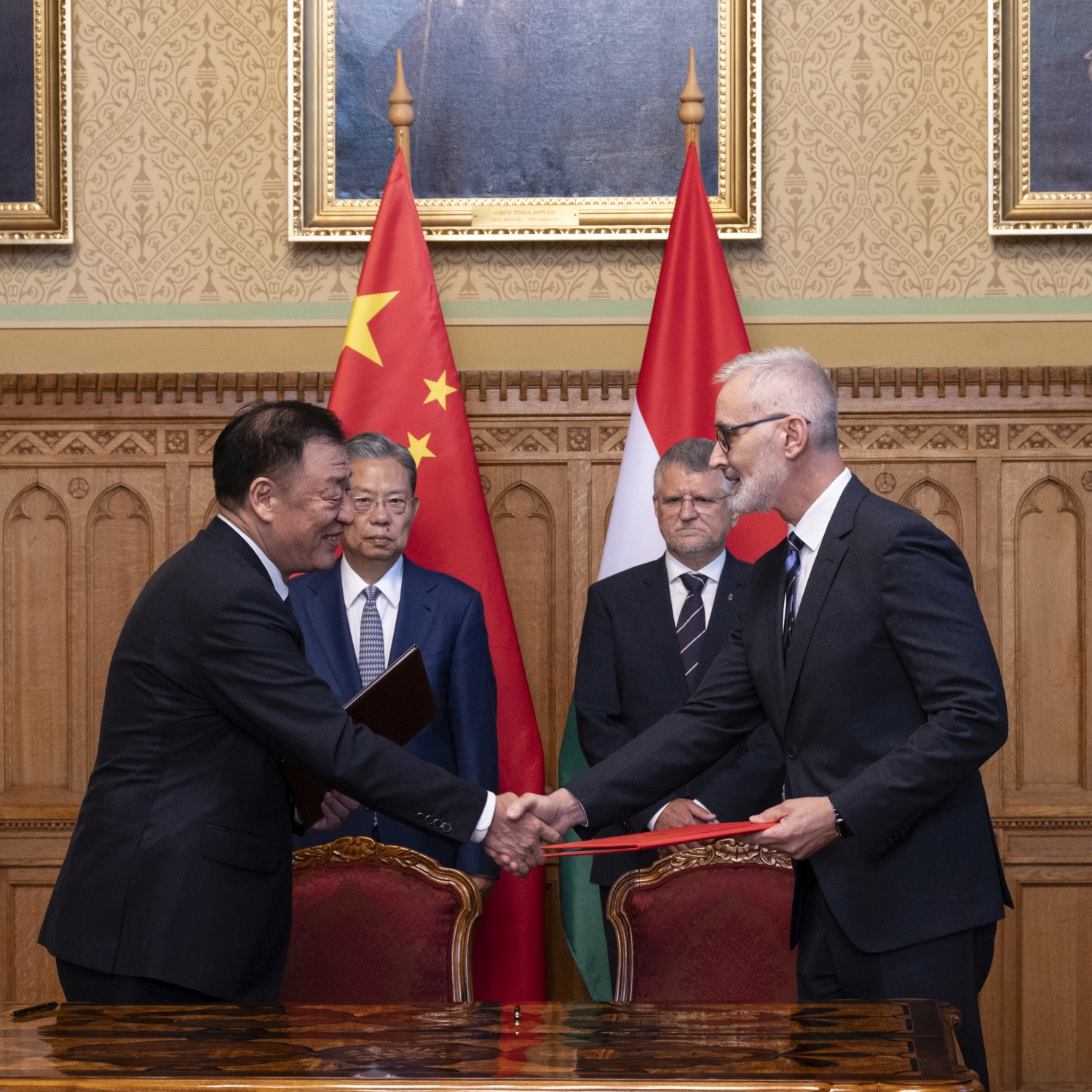 Budapest, 2025. július 25. Such György, az Országgyűlés Hivatalának főigazgatója (elöl j) és Liu Csi, a Kínai Népköztárság Országos Népi Gyűlése Állandó Bizottságának főtitkára (elöl b), miután együttműködési megállapodást írtak alá Zhao Leji, a bizottság elnöke (hátul b) és Kövér László házelnök (hátul j) jelenlétében az Országház Pázmándy-termében 2025. július 25-én. MTI/Szigetváry Zsolt