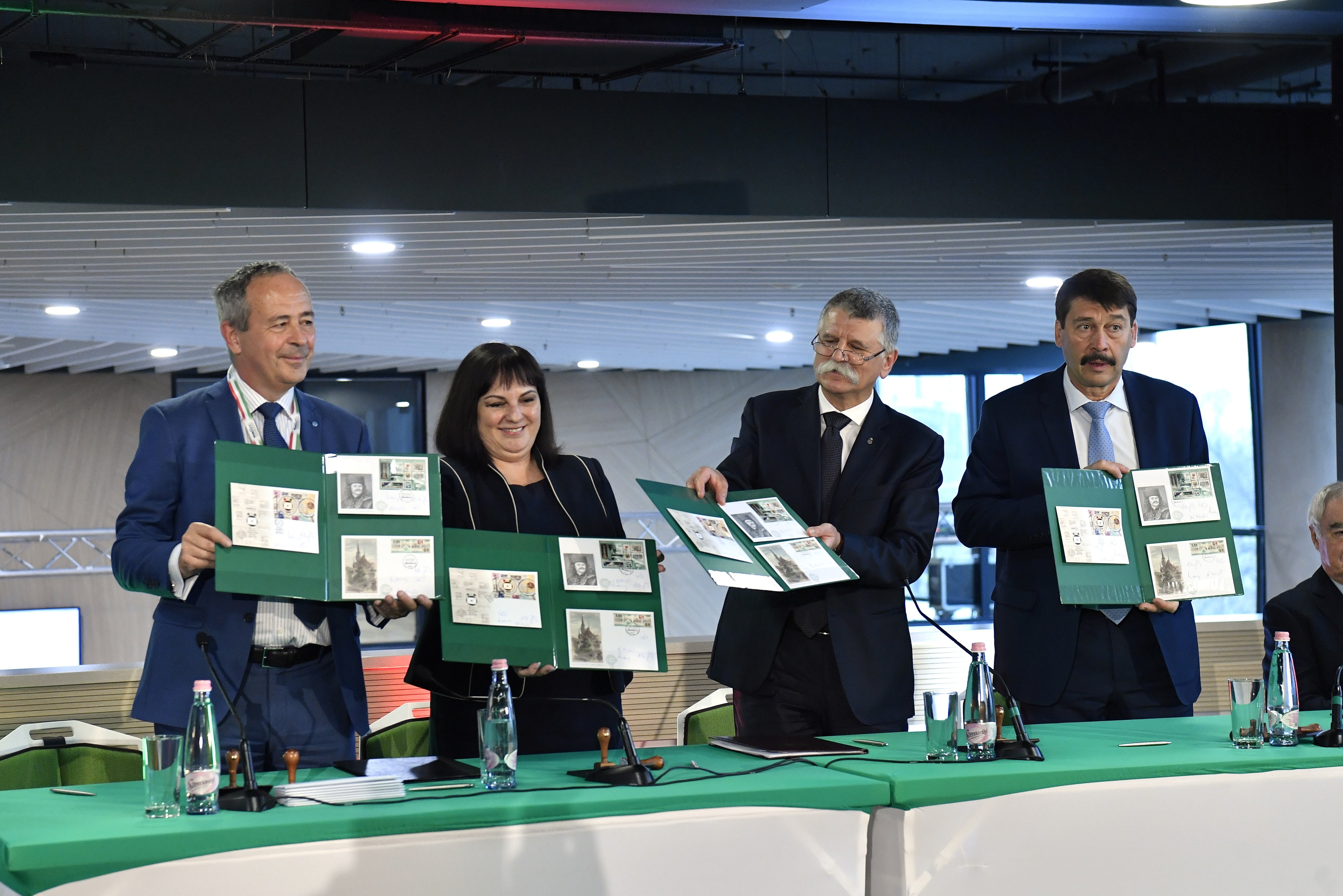 Megnyílt a HUNFILEX 2022 Bélyeg-világkiállítás Budapesten Szöveg:	Budapest, 2022. március 31. Áder János köztársasági elnök, Kövér László, az Országgyűlés elnöke, Hegmanné Nemes Sára, a Magyar Posta Zrt. elnöke és Homonnay Géza, a Magyar Bélyeggyűjtők Országos Szövetsége (MABEOSZ) elnöke (j-b) a HUNFILEX 2022 Bélyeg-világkiállítás alkalmából kibocsátott bélyegeket mutatják a Grupama Arénában 2022. március 31-én. A 44 ország részvételével zajló négynapos esemény alkalmából a Magyar Posta több különleges alkalmi bélyeget is kibocsátott. MTI/Máthé ZoltánA mostani kiállításon 44 ország közel 300 gyűjtője mutatja be anyagait, amelyeket 40 tagú nemzetközi zsűri értékel.