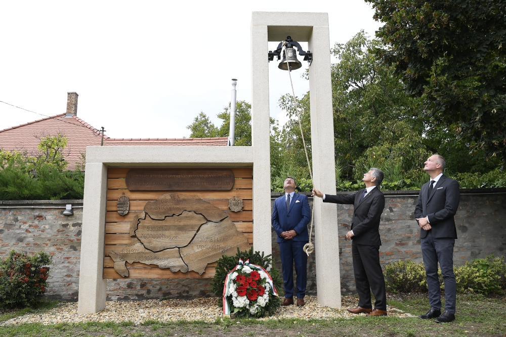 Felavatták a Nemzeti összetartozás harangját Piliscsabán Szöveg:	Piliscsaba, 2022. szeptember 11. Kövér László, az Országgyűlés elnöke a piliscsabai Nemzeti összetartozás műegyüttesének utolsó darabjának, az erdélyi összetört harangokból újraöntött nemzeti összetartozás harangjának avató ünnepségén 2022. szeptember 11-én. Mellette Kiss Antal (b), az adományozó család képviselője és Farkas András polgármester. MTI/Kovács TamásAz európai - és benne a Kárpát-medencében együtt élő - nemzeteknek ilyen kötélbarátságot kell kötniük egymással azért, hogy Európa túljusson a maga XXI. századi sziklafalán, hogy "gyerekeink és unokáink ne elszenvedői, hanem alakítói legyenek a jövőnek".