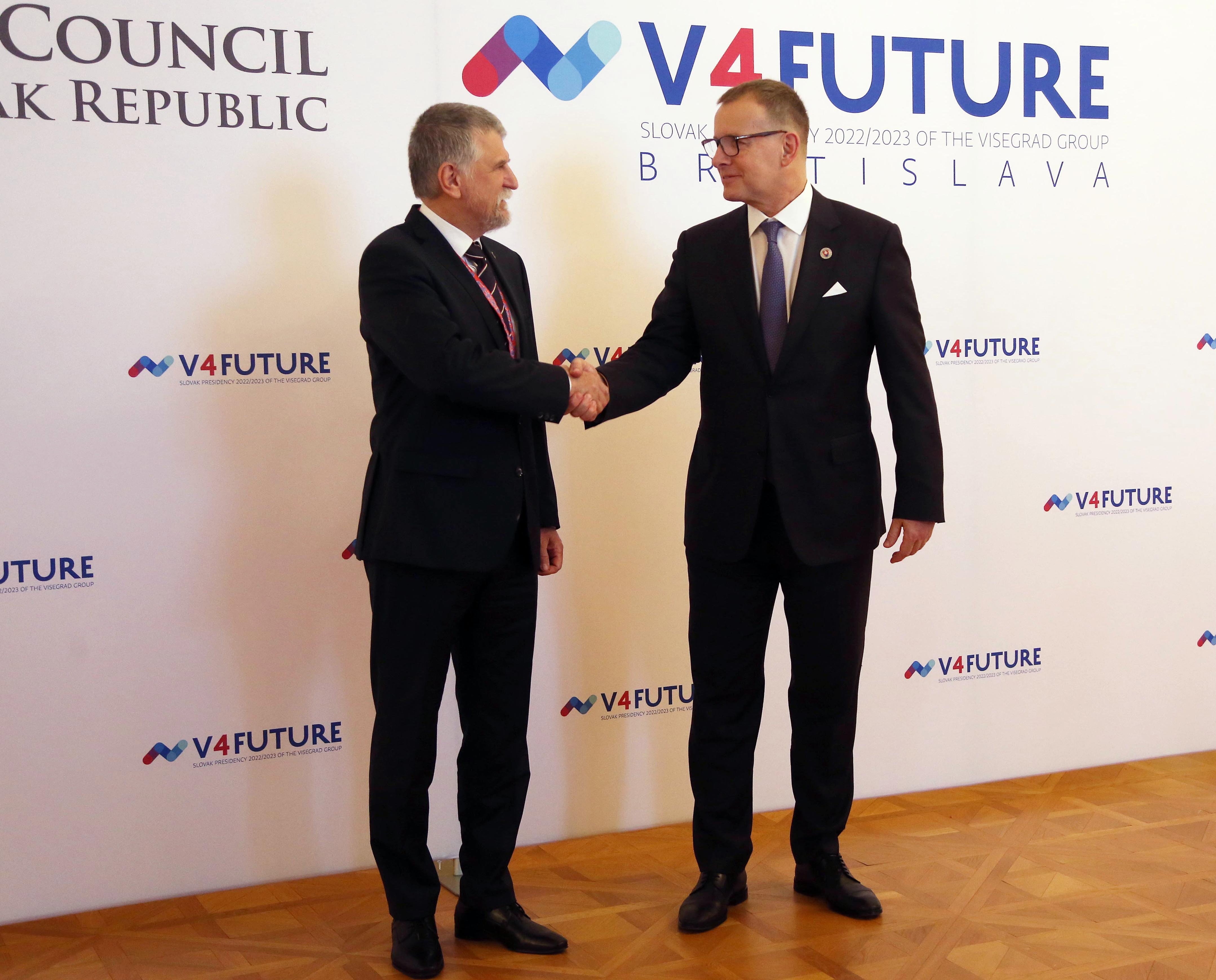 A V4-ek parlamenti elnökeinek találkozója Pozsonyban Szöveg:	Pozsony, 2023. február 3. Boris Kollár, a szlovák parlament, a nemzeti tanács elnöke (j) és Kövér László, az Országgyűlés elnöke (b)  a visegrádi csoport (V4) országai parlamenti elnökeinek találkozóján a pozsonyi várban 2023. február 3-án. MTI/Filep IstvánA pozsonyi házelnöki találkozón központi témaként a régió biztonsági helyzete, az ukrajnai háború, valamint az energiaválság és az illegális migráció volt terítéken.
