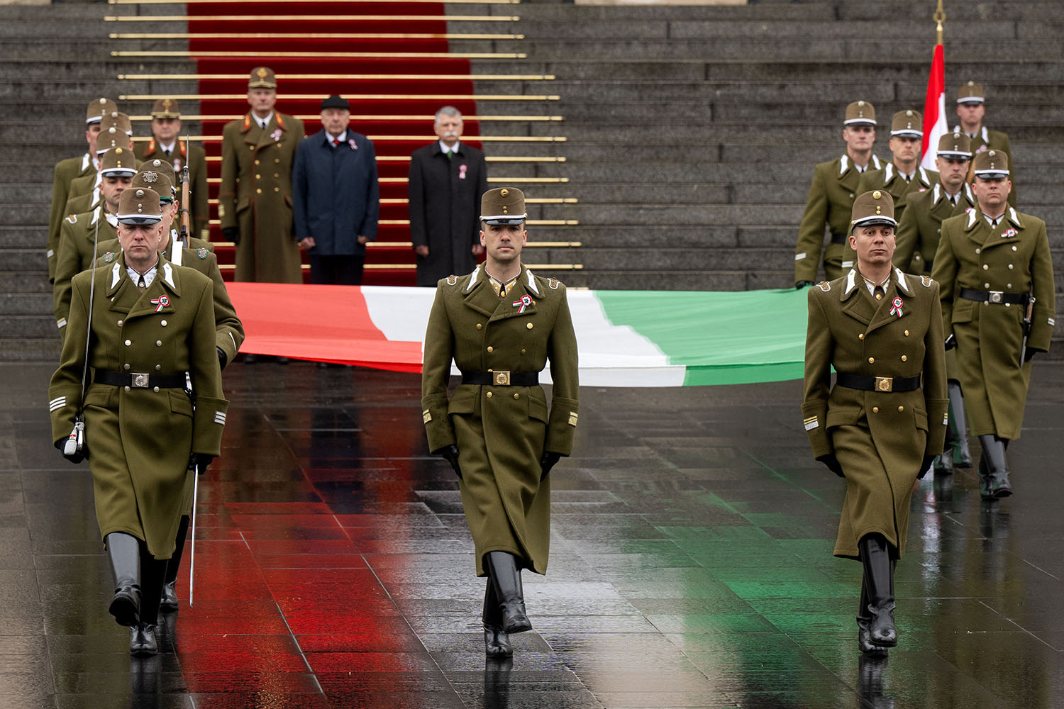 Katonai tiszteletadás mellett felvonták a nemzeti lobogót a március 15-i nemzeti ünnepen, szombat délelőtt Budapesten, a Parlament előtti Kossuth Lajos téren.
