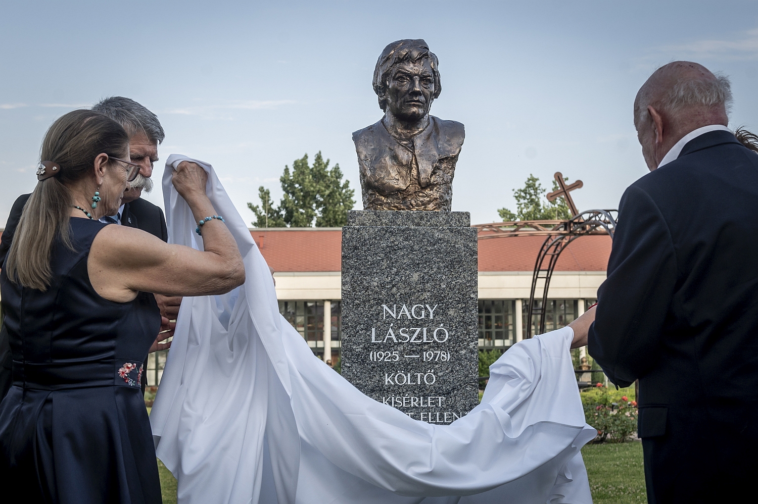 Lakitelek, 2025. július 4. Lezsákné Sütő Gabriella, Kövér László, az Országgyűlés elnöke és Bíró Zoltán irodalomtörténész (b-j) leleplezik Nagy László költő, műfordító szobrátn Lakitelken, a Kölcsey-ház előtt 2025. július 5-én. MTI/Ujvári Sándor